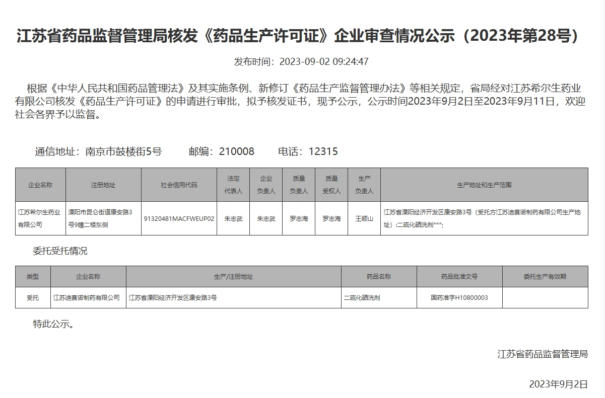 江苏省药品监督管理局核发《药品生产许可证》企业审查情况公示(2023年第28号)